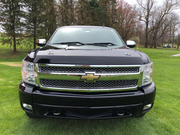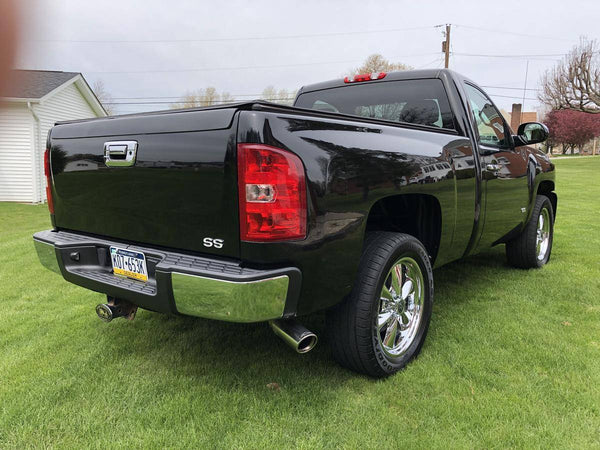 Dealer-made SS carpeted bed, hood pins, chrome and painted mirrors, chrome door handles, chrome exhaust, custom grille, 20-inch chrome torn thrust wheels, custom houndstooth interior.