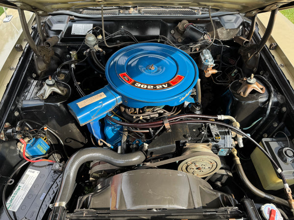 302 V8 motor with a 2 barrel carb. Beautiful engine compartment.